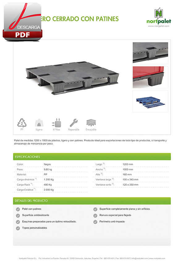Palet ligero cerrado con patines. Palet de medidas 1200 x 1000 de plástico, ligero y con patines. Producto ideal para exportaciones de todo tipo de productos, o transporte y