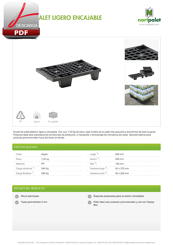 Cuarto de palet ligero encajable. Media paleta de plástico, ligera y encajable. Con sus 2,8 Kg de peso, este modelo es el palet más ligero y económico de toda la gama.