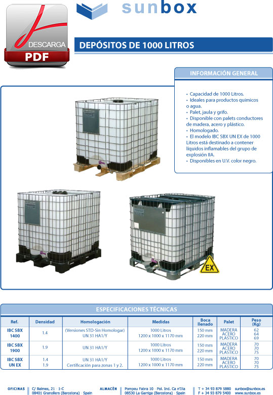 • El modelo IBC SBX UN EX de 1000 Litros está destinado a contener líquidos inflamables del grupo de explosión IIA.
