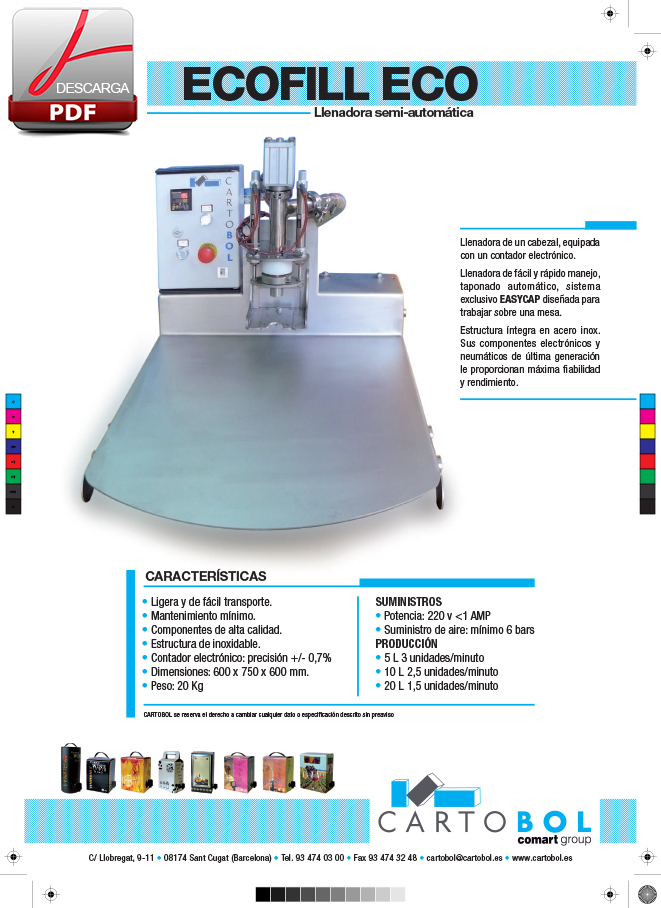 Llenadora de fácil y rápido manejo, taponado automático, sistema exclusivo EASYCAP diseñada para trabajar sobre una mesa.