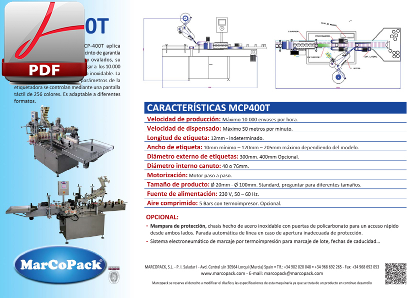 El sistema de etiquetado MCP-400T aplica etiqueta y/o contraetiqueta y precinto de garantía en envases cilíndricos, planos y ovalados, su velocidad de etiquetado puede llegar a los 10.000 envases hora.