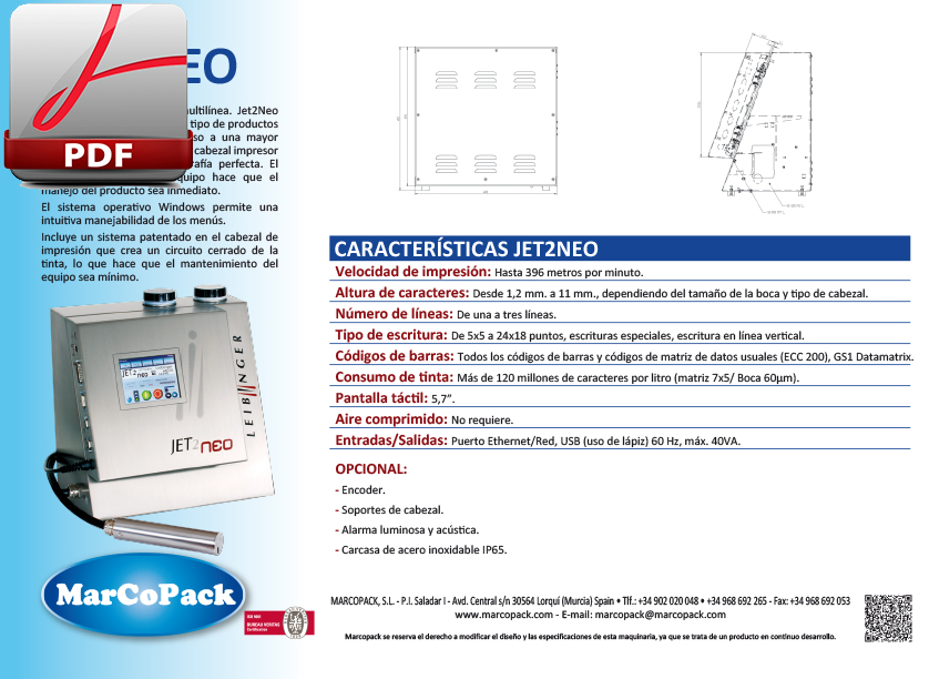 Rápida escritura de texto multilínea. Jet2Neo imprime sin contacto en todo tipo de productos con la máxima calidad. Incluso a una mayor distancia entre el producto y el cabezal impresor se ha conseguido una tipografía perfecta. El secado rápido de este equipo hace que el manejo del producto sea inmediato.