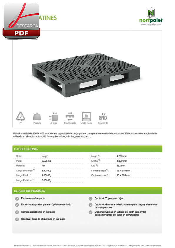 Palet industrial de 1200×1000 mm, de alta capacidad de carga para el transporte de multitud de productos. Este producto es ampliamente