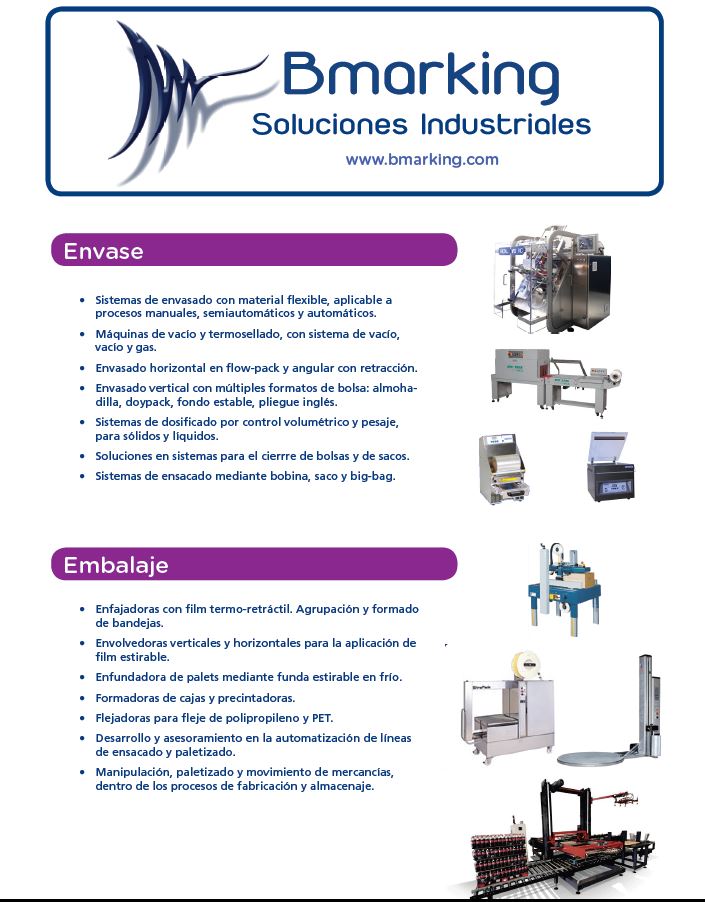 En BMARKING maquinaria y embalaje nuestro objetivo principal es lograr la satisfacción de los clientes a través de un asesoramiento y prescripción ajustada a las necesidades de cada momento; para ello representamos a una serie de reconocidos fabricantes especializados en las diferentes tecnologías, para poder dar así un servicio integral a nuestros clientes.