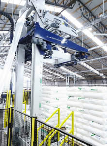 Para paletizar los sacos de plástico, formados a partir de una bobinade film plástico y reforzados lateralmente HAVER & BOECKER contó con la experiencia y el conocimiento de su filial, NEWTEC BAG PALLETINZ, miembro del Grupo Haver desde 2012.
