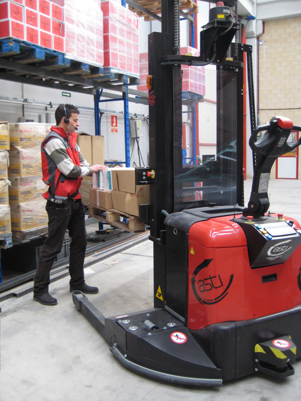 Su manejo es tan sencillo que el periodo de aprendizaje se reduce al máximo y se empiezan a obtener los beneficios de su uso de manera inmediata. Mientras que el sistema de picking lanza sencillas órdenes al operario para la preparación de pedidos, el AGV permanece a su lado esperando con las horquillas a la altura más adecuada para realizar el depósito de los materiales seleccionados, es más, el vehículo además de transportar automáticamente el pedido en curso, marca al operario el camino a seguir para encontrar las ubicaciones donde se encuentra el material indicado a través de los auriculares del sistema de picking por voz.