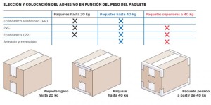 En cuanto a la forma de colocación de la cinta adhesiva 3M existen diferentes elecciones atendiendo a su peso y el tipo de transporte como se muestra en la siguiente imagen: