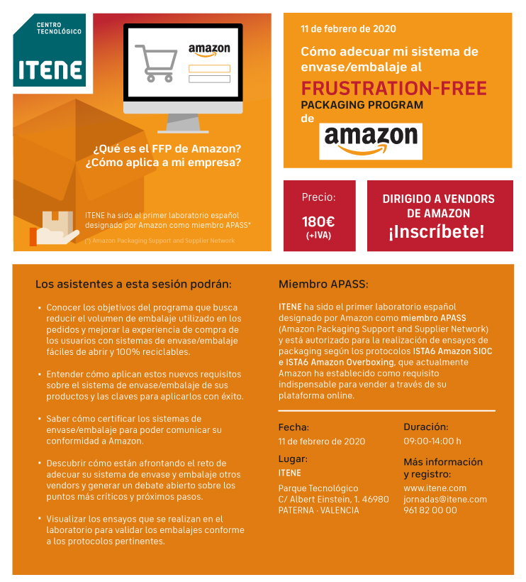 El próximo 11 de febrero ITENE vuelve a organizar la jornada «Frustration-Free» de Amazon, en la que se enseñará cómo adecuar el sistema de envase/embalaje al Frustration-Free Packaging Program de Amazon. En ella se abordarán los objetivos para reducir el volumen de embalaje utilizado en los pedidos y mejorar la experiencia de compra de los usuarios con sistemas de envase/embalaje fáciles de abrir y 100% reciclables, además de saber cómo certificar sus sistemas de envase/embalaje para poder comunicar su conformidad a Amazon.