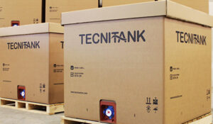 Tecnitank, es un contenedor para liquidos, realizado 100% en cartón ondulado de alta resistencia, para transporte y almacenamiento de 1.000 litros de líquido a granel, de manera segura y económica. Cuenta con una bolsa interior, que puede ser aséptica si se necesitase, para proteger su contenido, garantizando que el aire no modifique sus cualidades y se mantenga en perfecto estado.