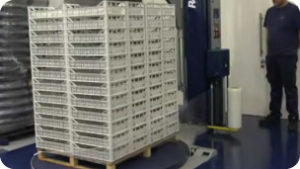 Enfardadora de palets equipada con sistema de pre-estirado del film para asegurar cargas inestables y ahorrar material de embalaje.
