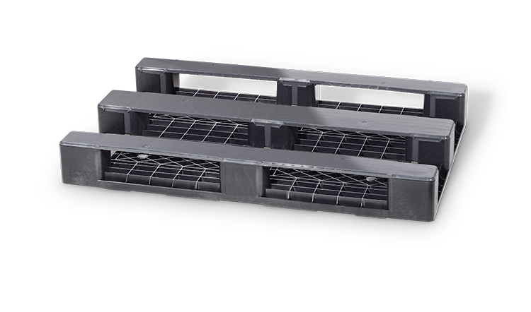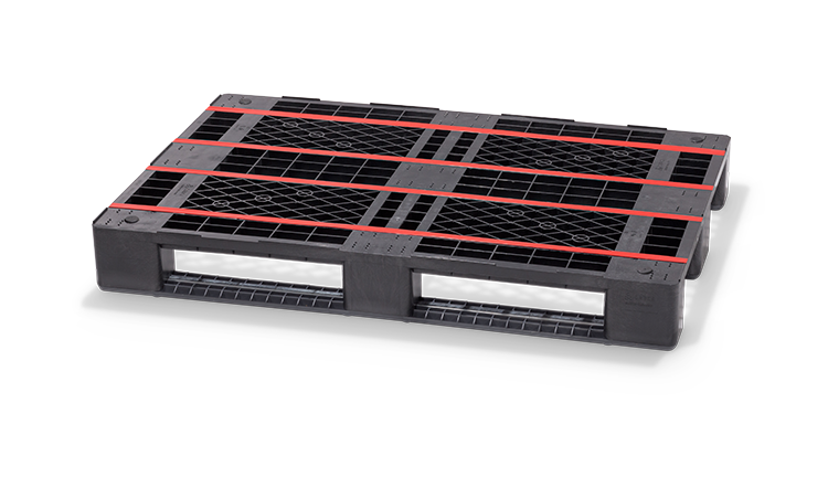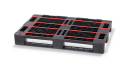 Palet de plástico de 800x1200x145 mm con las mismas cotas y formato que el palet de madera EUR epal / uic homologado, apto para almacenes robotizados en donde se usa este tipo de paleta. Gracias a su diseño permite ser identificado por todos los sensores en todo el recorrido.