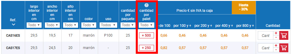 En todo nuestro catálogo y web contamos con descuentos progresivos, comprando palets completos, el precio unitario es más económico. Comprando por palet conseguirás aprovechar mejor tu presupuesto, consiguendo comprar más embalaje por menos dinero. Tanto en nuestro catálogo como en nuestra web, podrás encontrar el precio especial por palet detacado en una columna.