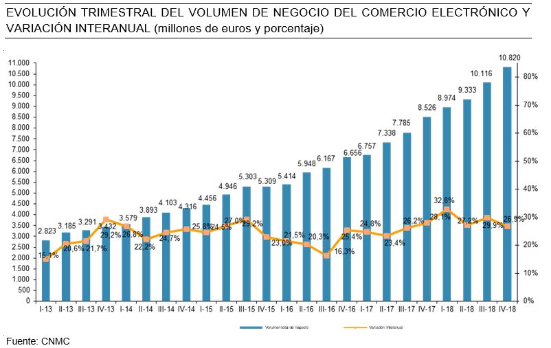 La facturación del comercio electrónico en 2018 alcanzó los 39.243 M€ en España, un 29,1% más que un año antes, cuando se situó en 30.406 M, según los últimos datos publicados en el portal CNMCData, de la Comisión Nacional de los Mercados y la Competencia. En el cuarto trimestre obtuvo unas ventas de 10.820 M, lo que representa un incremento del 26,9% interanual. En esos tres meses se registraron más de 205 M de transacciones online, un 33,2% más.