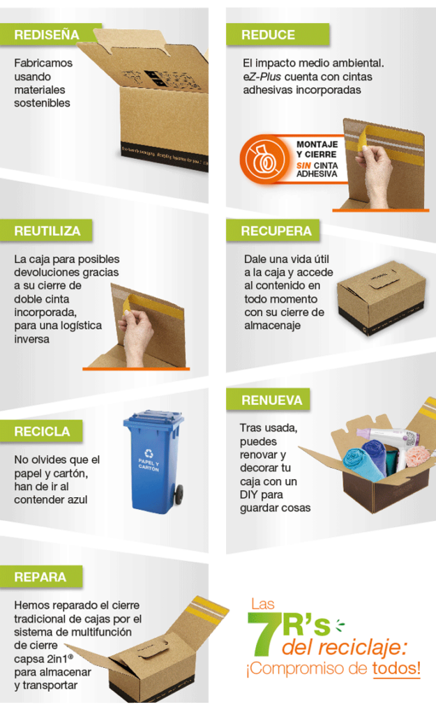 Entendiendo por residuo, cualquier tipo de material -orgánico o inorgánico-, que ha sido desechado en un contenedor gris con parada final: el vertedero. Requiriendo de una incineración para su transformación en energía eléctrica y vapor para la red de climatización, como nos comentan en La Vanguardia que sucede en Planta Integral de Valorización de Residuo ubicada en Barcelona.3 Aunque, es de suponerse: mayor tonelada de residuos, mayor emisión de CO2, conllevando a un mayor impacto medio ambiental. Desde Capsa® creemos que es de vital importancia el uso de materiales y embalajes que contribuyan a un e-commerce y proceso logístico más sostenible. Es por ello, que queremos demostrarte como nuestra caja eZ-Plus ha logrado ‘encajar’ con las 7R’s del Reciclaje.