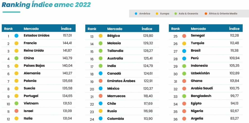 Estados Unidos encabeza el ranking por tratarse de un mercado de grandes dimensiones y dinamismo, afianzado por el acuerdo de libre comercio T-MEC. El ranking sitúa en la parte alta a los países europeos, que siguen siendo los principales socios por la facilidad de hacer negocios y la gobernanza. Los países asiáticos destacan por su gran proyección económica y capacidad de mercado. China, pese a las dudas que genera la burbuja inmobiliaria, «es un país que sigue sin poder obviarse, sobre todo en determinados sectores», e India se distingue por su dimensión, una nueva clase media creciente y su deseo de modernizarse e industrializarse. El valor del informe que emite el Observatorio amec radica en los índices de oportunidad sectorial y sus valoraciones cualitativas, ya que cada sector cuenta con un ranking de países propio en el que se detallan además las oportunidades concretas en cada mercado. «Incluso en un mismo sector, a cada empresa puede interesarle, según su estrategia, un mercado distinto», explica el director general de amec.