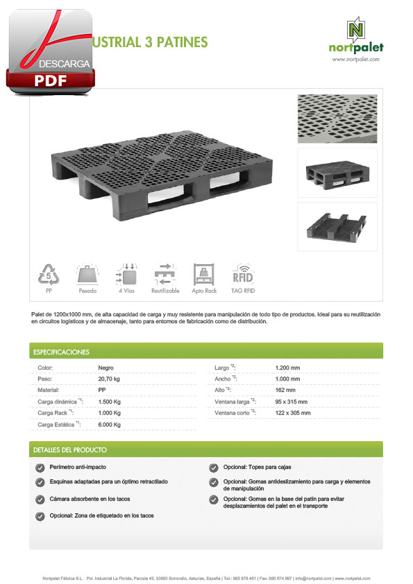 Palet de 1200×1000 mm, de alta capacidad de carga y muy resistente para manipulación de todo tipo de productos. Ideal para su reutilización en circuitos logísticos y de almacenaje, tanto para entornos de fabricación como de distribución.