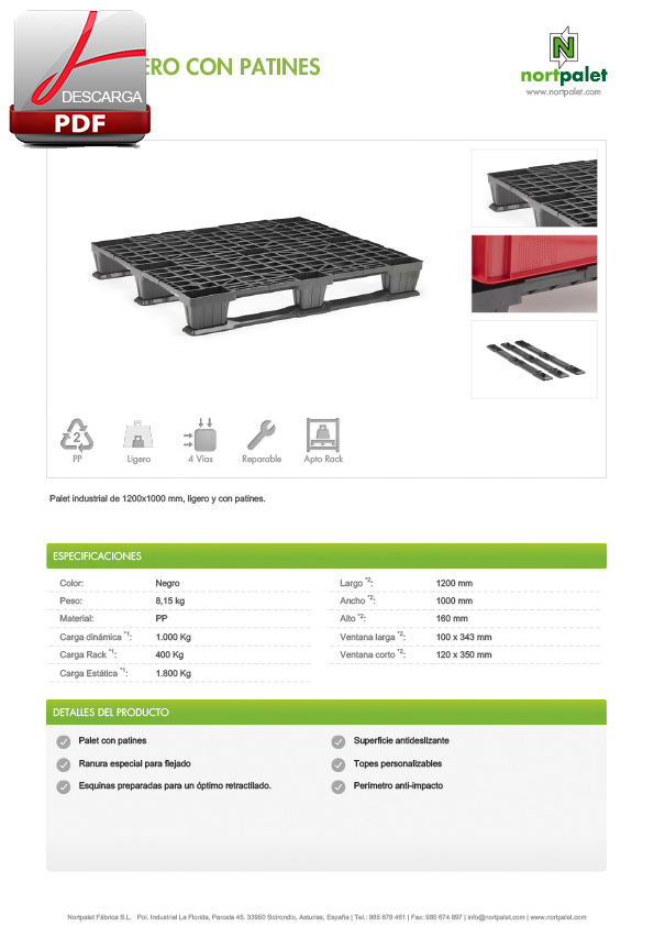 Palet industrial de 1200×1000 mm, ligero y con patines.