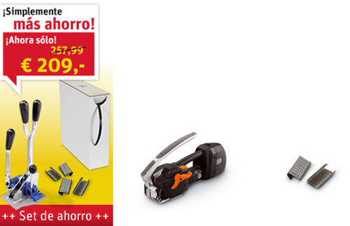 1 rollo de flejo con el carrito distribuidor, aparato de cierre y grapas – ¡Pídelo ahora y ahorra mas dinero así de fácil! El set ideal para sistema de fleje par ala optimización del almecén y al mismo tiempo de asegurar paquetes, juntar y cargar palets con pesos ligeros.