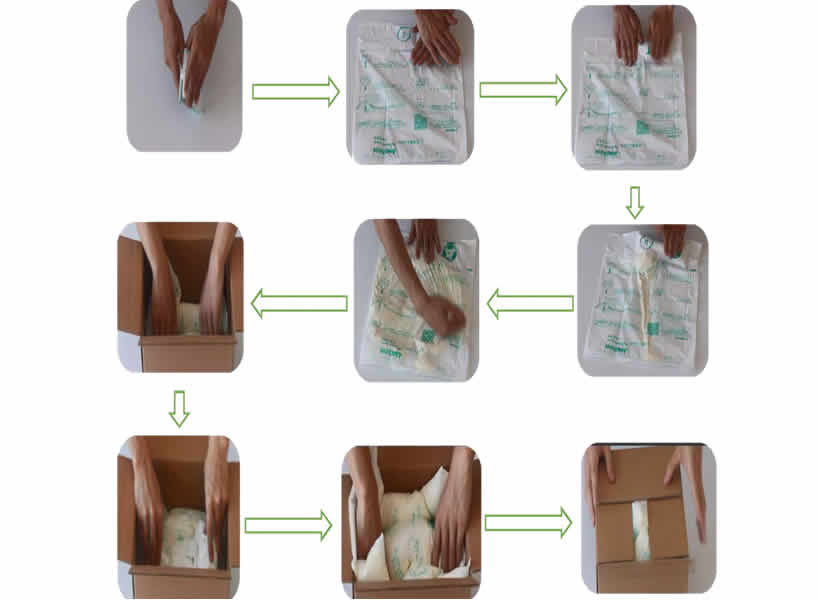 4. Repetir la operación 1 en una nueva bolsa, colocarla encima del producto y cerrar la caja para formar la protección superior.