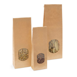 Bolsa de fondo plano de papel verjurado con visor, es el embalaje natural para pequeños regalos, alimentos, dulces y productos molidos.