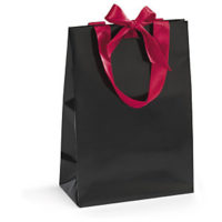 Aspecto: Papel charol satén, asas y lazo de satén rojo para color negro y plateado para color blanco.
