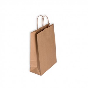 Bolsa Kraft color marrón kraft con asa de papel rizado. Medidas Bolsa: 32cm de ancho x 13cm fuelle lateral x 42,5cm de alto. Ideal para comercios, inmejorable imagen para su tienda. Muy resistente. Posibilidad de personalizar las bolsas a 1 tinta a 2 caras. Opción de compra por packs de 100, 250, 500 o 1.000 unds. Tiempo de entrega entre 24h – 48h. Contacta con nosotros para más información info@cajadecarton.es o llamando al 902 09 008 5