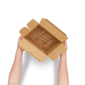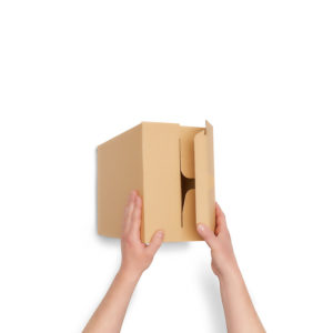 Caja para botellas marrón o blanco, para el envío seguro de botellas. El fondo automontable está listo con un sencillo gesto y evita que las botellas golpeen entre sí durante el transporte.
