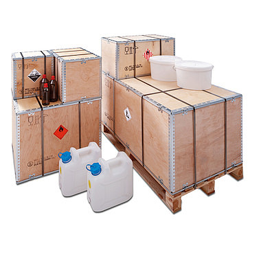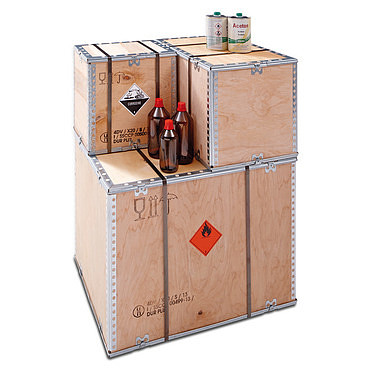Caja de madera para mercancías peligrosas. Consta de tres piezas y su uso está autorizado para el envío por tierra (RID/ADR), mar (IMDG) y aire (IATA).