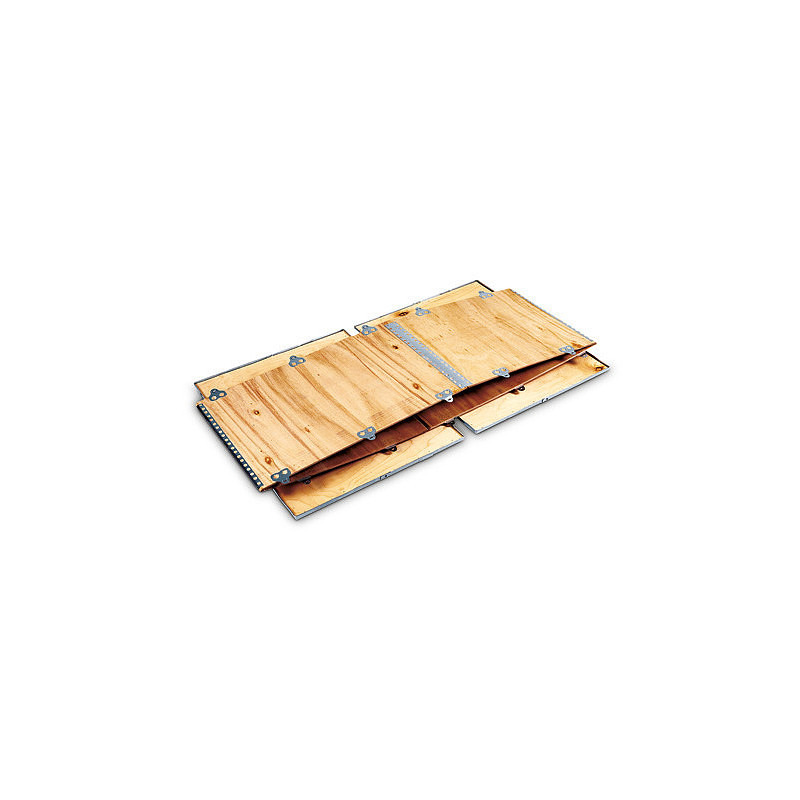 Cajas con patines. ¡Ya no necesita palet! Caja plegable, fabricada en contrachapado de abedul con bordes de chapa de acero y aluminio galvanizado, con patines de madera maciza. Cierre mediante lengüetas incorporadas.