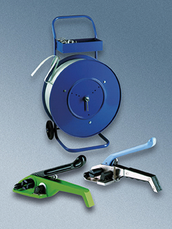 Carrito dispensador de fleje para todo tipo de bobinas y tensor carraca con corte reutilizable para todo tipo de flejes y cintas de hasta 50 mm.