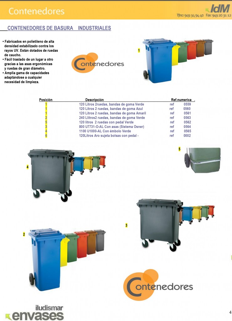 • Fabricados en polietileno de alta densidad estabilizado contra los rayos UV. Están dotados de ruedas 1 de caucho.