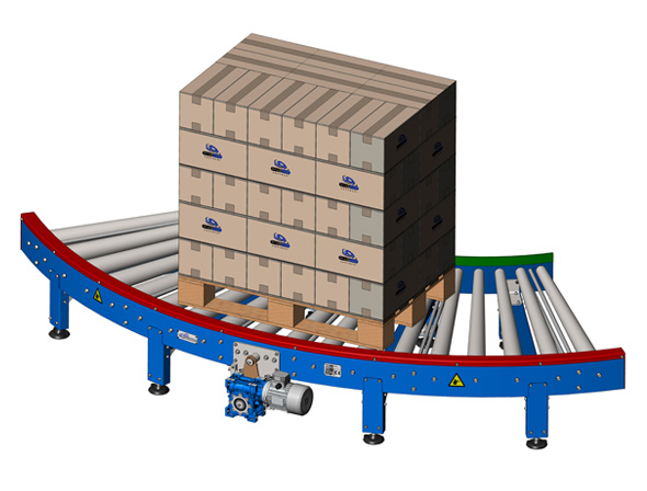Curva modular rodillos cónicos motorizados manipulación de pallet CRMP