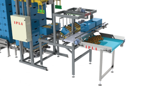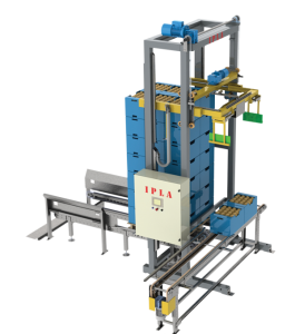 El palet lleno se deposita en un transportador de cadenas con el cual se va variando la posición del palet, existen tres posiciones según se vaya a retirar la primera, la segunda o la tercera fila.