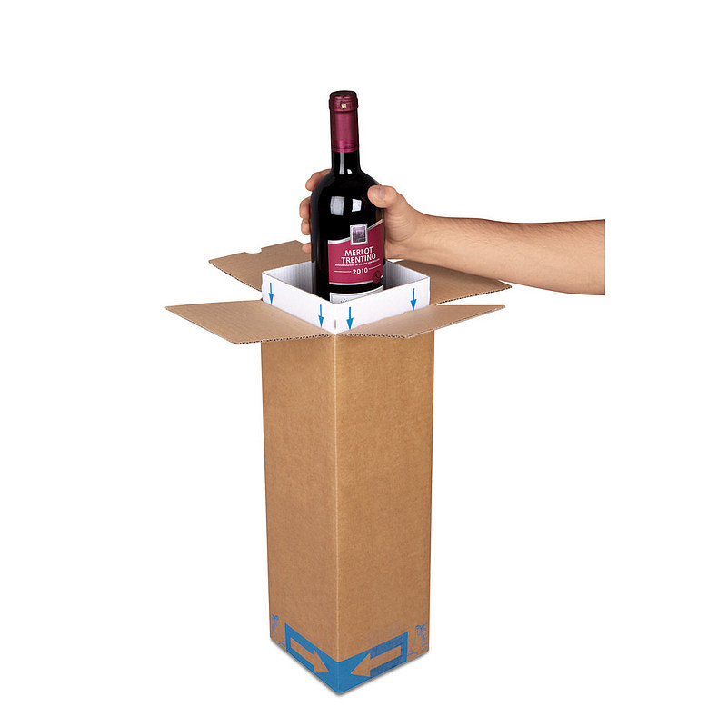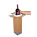 Embalaje de manipulación óptima para botellas con sujeción integrada que se dispone en la posición correcta por sí sola. La botella queda fija gracias a una sujeción de cartón corrugado del interior del sobreembalaje. ¡Así no se requiere material de relleno!