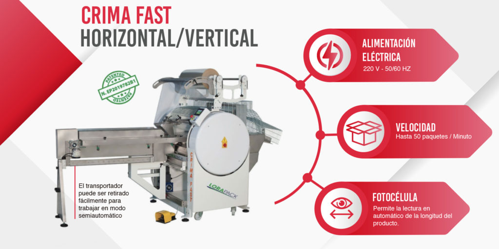 También CRIMA FAST es una solución patentada con cuerpo giratorio, pensada para realizar el empaquetado vertical, horizontal e inclinado. Una ventaja sin precedentes, que permite a nuestros clientes utilizar una sola máquina para todos los tipos de empaquetado.