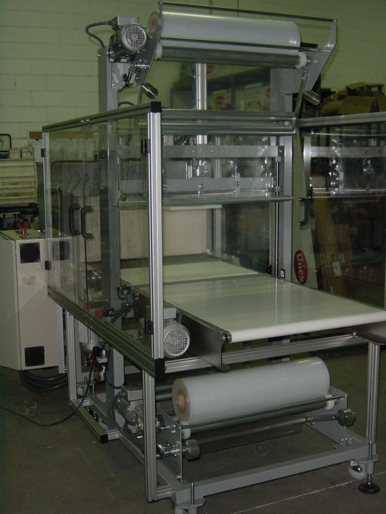 Máquina apta para el enfajado automático de productos con film de polietileno retráctil.