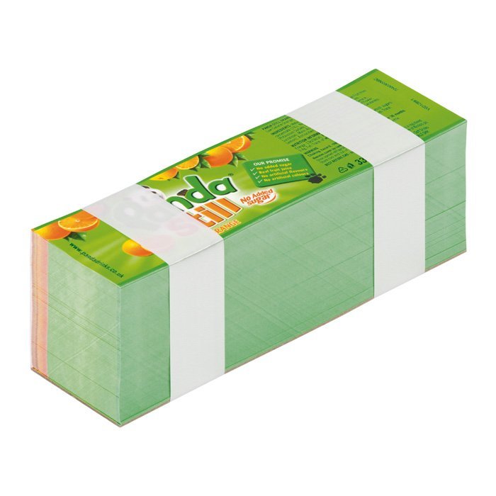 En la mesa de introducción se alinean y separan los farods de etiquetas. Los fardos son empujados en hileras hacia la enfajadora US-2000 integrada. El número de fajas por fardo puede ser ajustado en la «pantalla táctil» de la longitud de fardo. Esta máquina especial permite el ajuste sencillo de los formatos al nuevo producto.