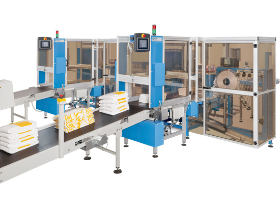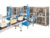 La US-2000 TRW-DMS-MP recoge ropa apilada en plano de seis máquinas plegadoras.