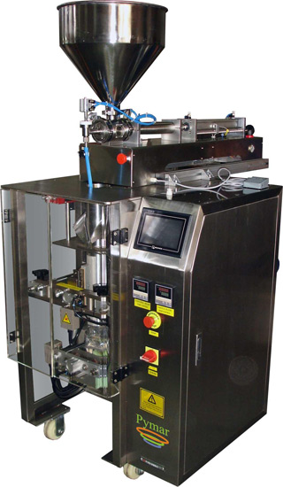 La máquina puede envasar el producto partiendo de film en bobina y realiza la bolsa sellando, llenando y terminado la misma. Puede incorporar centrador de serigrafía e impresor de fecha y lote.