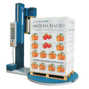 Macroplat S2 plataforma de mesa giratoria con sistema de pre-estiraje fijo a 250%, que fabrica y aplica film macroperforado sobre la carga a paletizar. Dispone de revolucionario sistema patentado que refuerza y perfora el film convencional para convertirlo en film macroperforado en el momento de embalar. La alimentación de la máquina con dos bobinas de film liso convencional las convierte