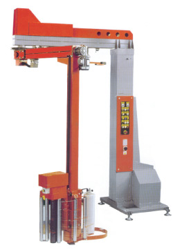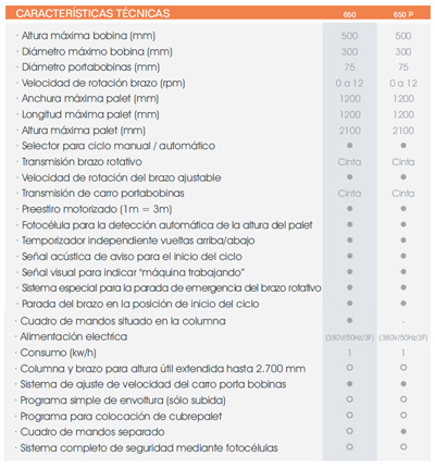 Envolvedora semi-automática para film extensible con sistema de brazo rotativo, ideal para cargas muy pesadas o inestables, no apta para operar en línea, también en versión sin columna preparada para fijarse directamente en la pared (650P).