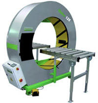 La velocidad de giro del aro regulable permite el embalaje de molduras, barras de aluminio, perfilería, tuberías, persianas, estanterías, muebles kit, módulos, tableros, ventanas y productos voluminosos. Con pedal de seguridad.