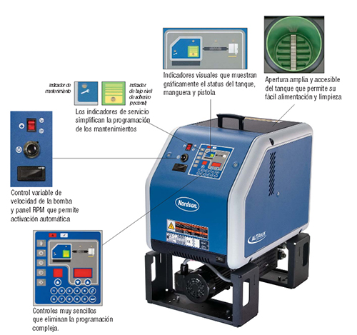 Los fusores de adhesivo Norson Altablue TT conjugan motores AC de velocidad variable con bombas de engranaje y funcionamiento automático en un diseño compacto. Satisfacen la necesidad de un sistema de fácil manejo y bajo coste de mantenimiento que además sea capaz de utilizarse con precisión para una amplia gama de adhesivos hot melt. Un tanque tubular en recubierto con Teflón elimina las esquinas muertas y minimiza la degradación de adhesivo. El panel de control, versátil y completo, ofrece la posibilidad de programar distintos modos de trabajo, usando el teclado y mostrando el estado del sistema.