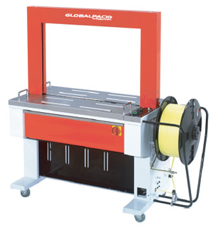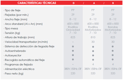 Flejadora automática de paquetería. Existen versiones con mesa motorizada a rodillos (A) o bandas (B) en cuyo caso incluyen fotocélulas y un sencillo programa que permite ajustar la distancia y número de flejadas por paquete.