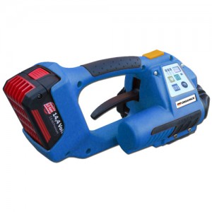 Máquina eléctrica semiautomática para el flejado manual de palets mediante soldadura por fricción.