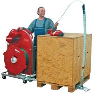 La lanza de cadenas no sólo lleva el fleje por debajo de la paleta como los sistemas semiautomáticos tradicionales, sino que lo levanta por el otro lado y la devuelve al usuario.