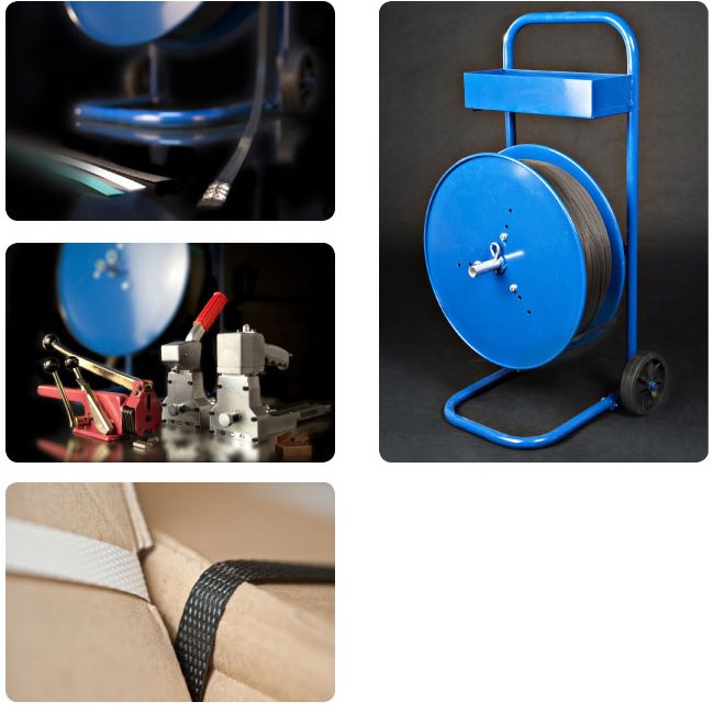 Los portabobinas para flejes de polipropileno y poliester estan provistos de un cajetín para colocar las grapas y la flejadora manual, así como de ruedas para facilitar su desplazamiento.