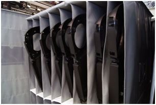 Embalajes flexibles y rígidos a medida de las piezas, con la peculiaridad de estar suspendidos en raíles para facilitar su movimiento y acceso dentro de la línea de montaje. Pueden contar tanto con estructura metálica como sin ella, perfectos para el manejo y abastecimiento a línea de grandes piezas inyectadas de plástico.