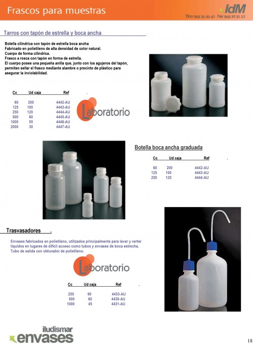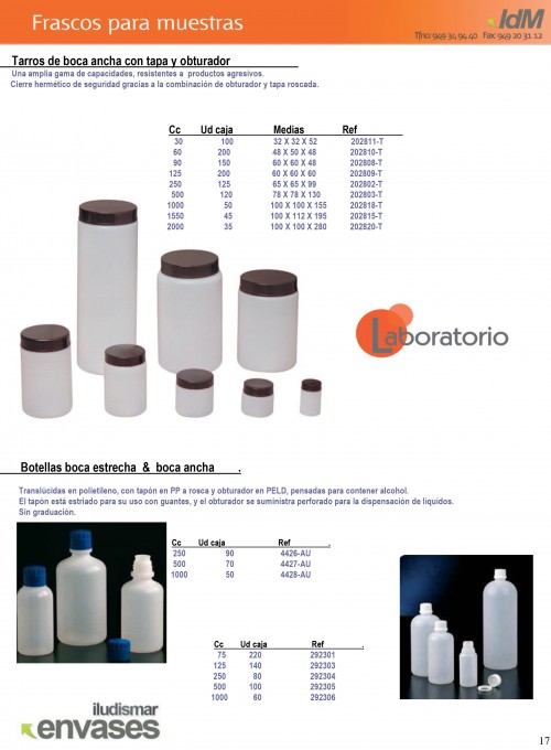 - Tarros de boca ancha con tapa y obturador . Una amplia gama de capacidades, resistentes a productos agresivos. Cierre hermético de seguridad gracias a la combinación de obturador y tapa roscada. Botellas boca estrecha & boca ancha . Translúcidas en polietileno, con tapón en PP a rosca y obturador en PELD, pensadas para contener alcohol. El tapón está estriado para su uso con guantes, y el obturador se suministra perforado para la dispensación de líquidos. Sin graduación.