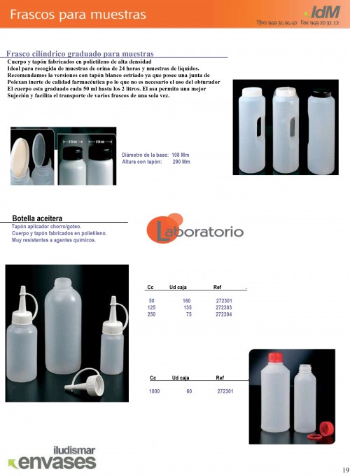 - Frasco cilíndrico graduado para muestras . Cuerpo y tapón fabricados en polietileno de alta densidad Ideal para recogida de muestras de orina de 24 horas y muestras de líquidos. Recomendamos la versiones con tapón blanco estriado ya que posee una junta de Polexan inerte de calidad farmacéutica po lo que no es necesario el uso del obturador El cuerpo esta graduado cada 50 ml hasta los 2 litros. El asa permita una mejor Sujeción y facilita el transporte de varios frascos de una sola vez. Botella aceitera . Tapón aplicador chorro/goteo. Cuerpo y tapón fabricados en polietileno. Muy resistentes a agentes químicos.
